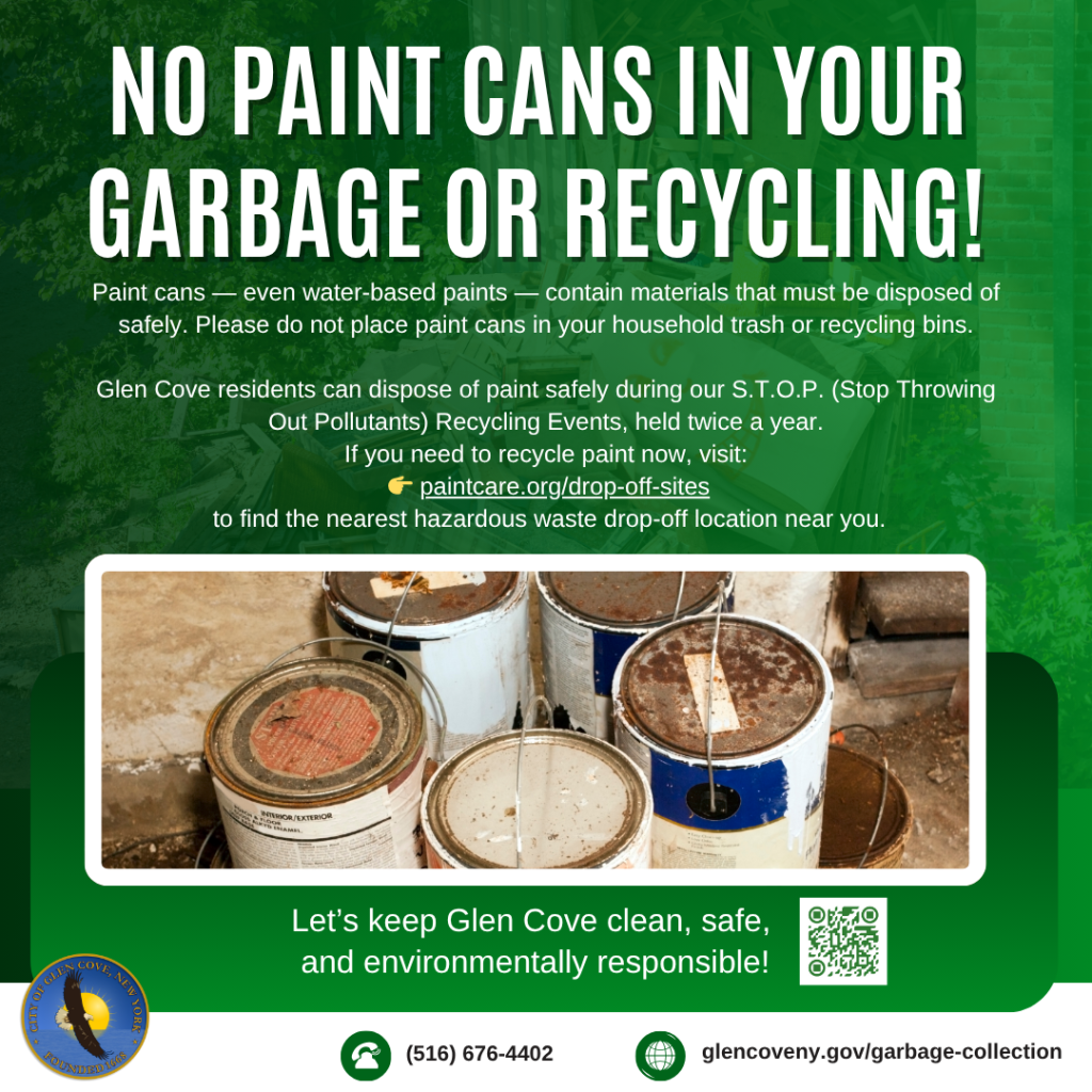 Glen Cove residents can safely dispose of paint during the City’s S.T.O.P. (Stop Throwing Out Pollutants) Recycling Events, held twice a year.