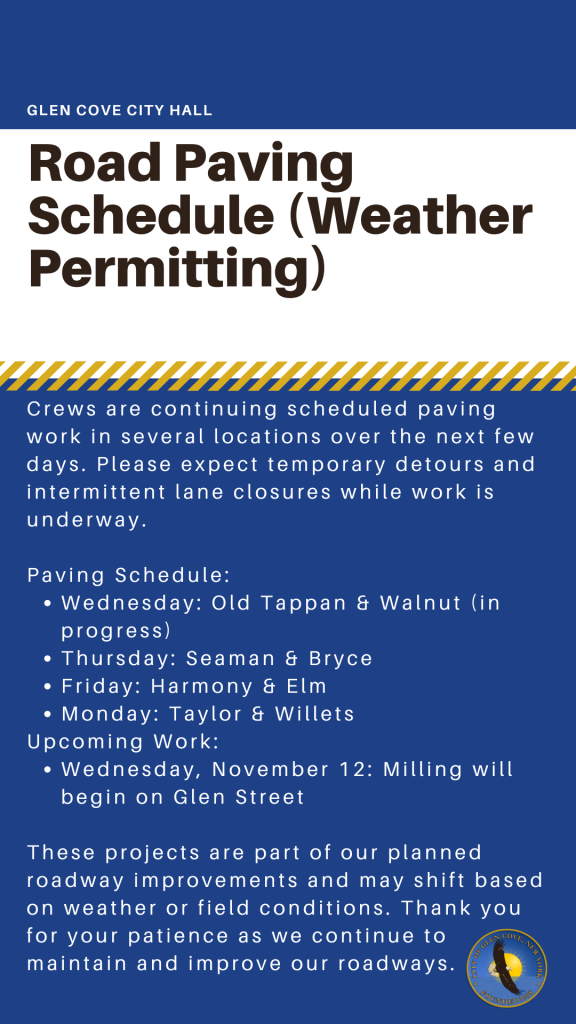 Crews are continuing scheduled paving work in several locations over the next few days. Please expect temporary detours and intermittent lane closures while work is underway.