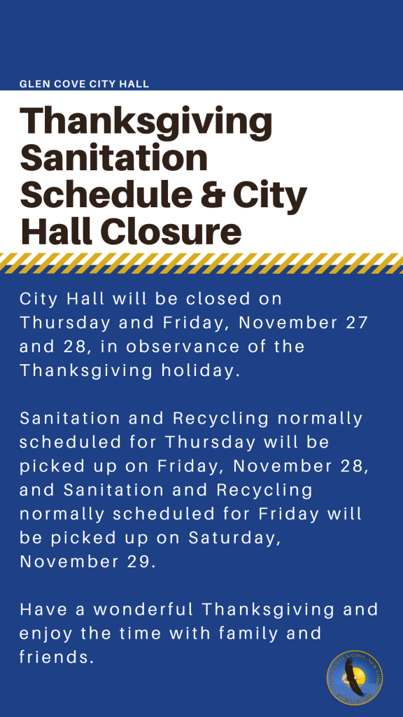 A reminder: City Hall will be closed on Thursday and Friday, November 27 and 28, in observance of the Thanksgiving holiday.