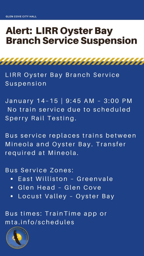 Due to scheduled Sperry Rail Testing, LIRR service on the Oyster Bay Branch will be suspended on Wednesday, January 14 and Thursday, January 15, from 9:45 AM to 3:00 PM.