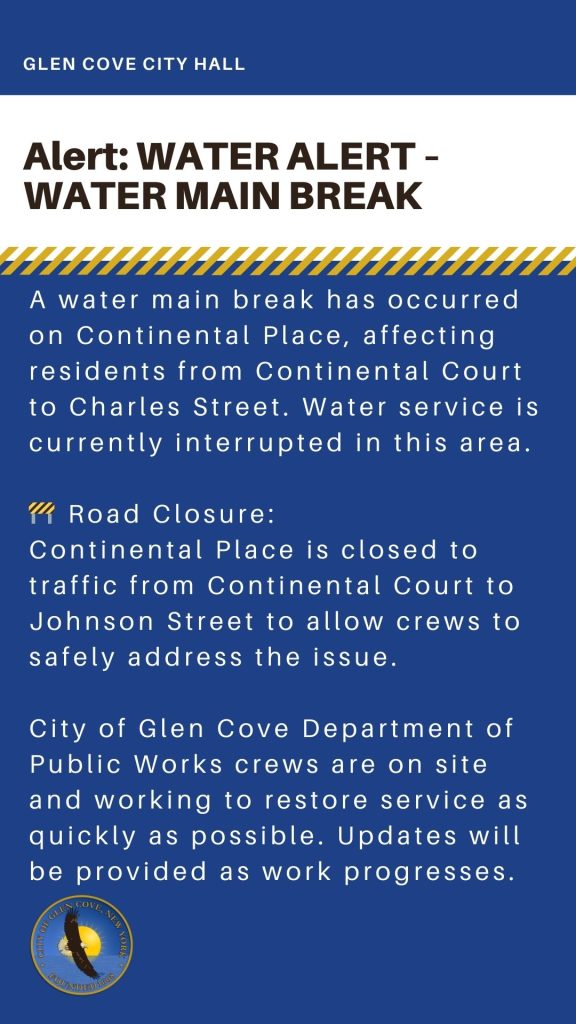 City of Glen Cove Department of Public Works crews are on site and working to restore service as quickly as possible. Updates will be provided as work progresses.