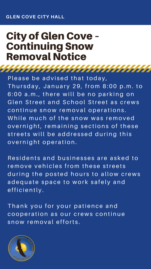 Please be advised that today, Thursday, January 29, from 8:00 p.m. to 6:00 a.m., there will be no parking on Glen Street and School Street as crews continue snow removal operations.