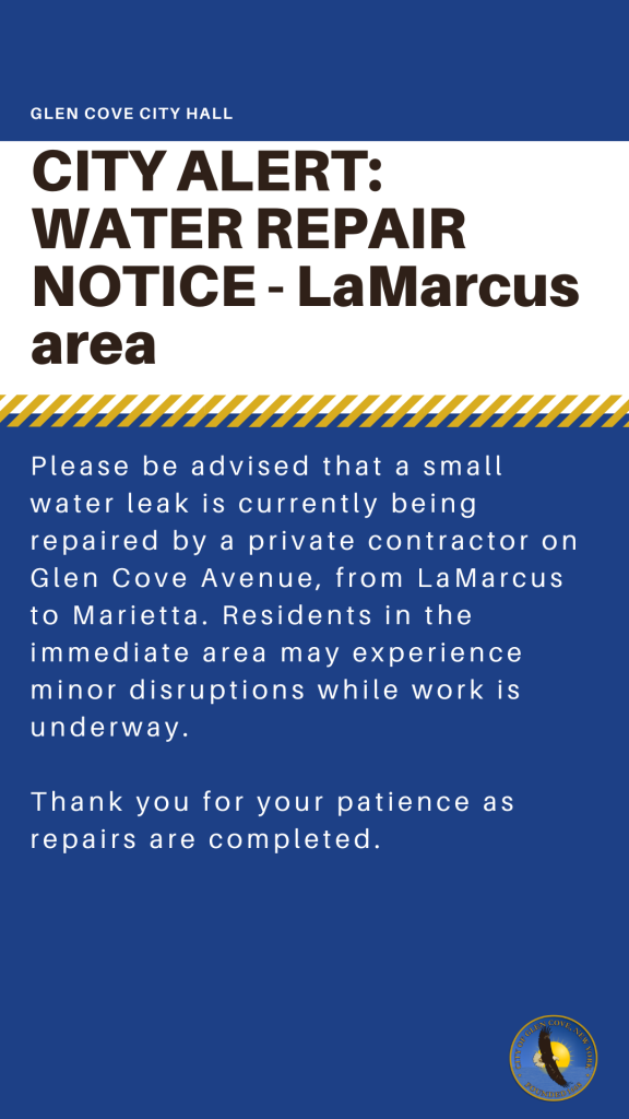 Please be advised that a small water leak is currently being repaired by a private contractor on Glen Cove Avenue, from LaMarcus to Marietta. Residents in the immediate area may experience minor disruptions while work is underway.