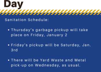 Sanitation Schedule: Thursday’s garbage pickup will take place on Friday, January 2 Friday’s pickup will be Saturday, Jan. 3rd There… Read More