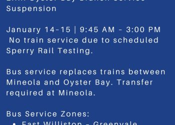 Due to scheduled Sperry Rail Testing, LIRR service on the Oyster Bay Branch will be suspended on Wednesday, January 14… Read More