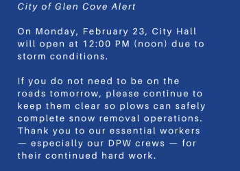 City of Glen Cove Alert On Monday, February 23, City Hall will open at 12:00 PM (noon) due to… Read More