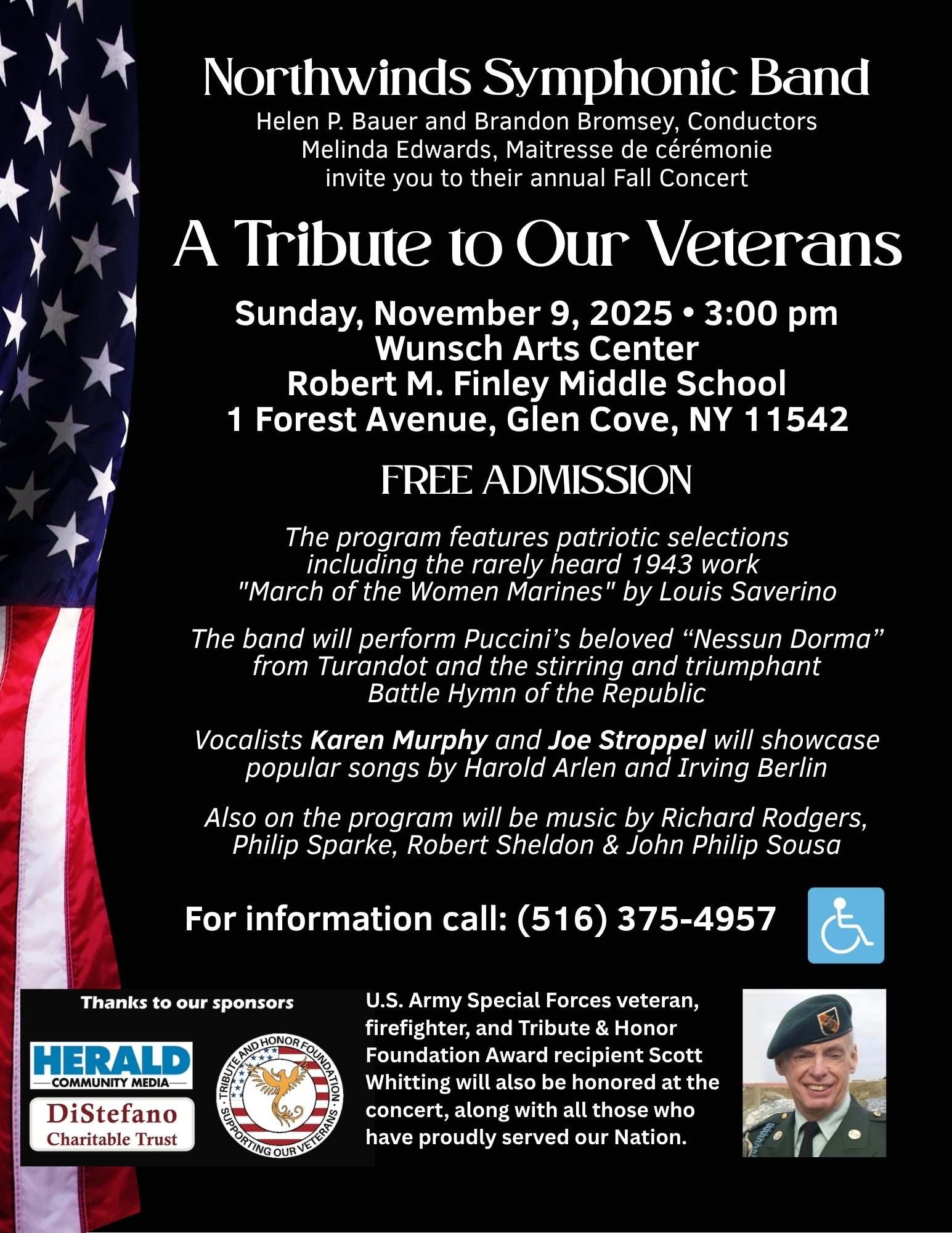 11/9—Veteran's Day Tribute: Northwinds Symphonic Band Free; Robert Finley Middle School 3:00 pm
