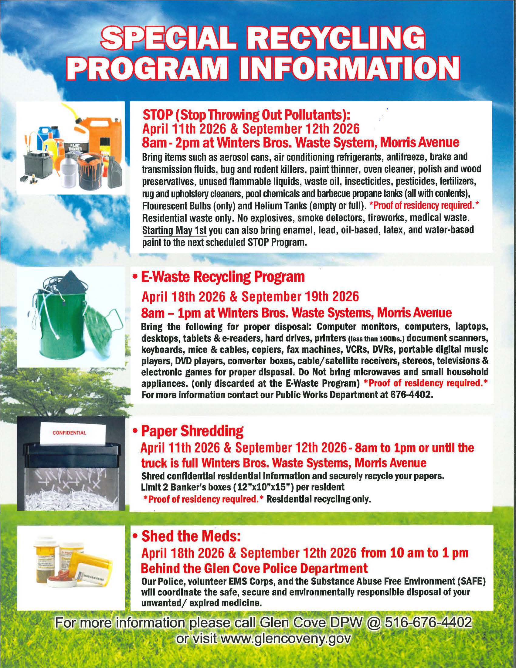The City of Glen Cove WILL NOW pick up your grass clippings. Residents with proper ID may bring their grass clippings to the DPW Yard located at 100 Morris Avenue. Private Landscapers are NOT permitted to use this site for drop-off. Alternatively, you may place your grass clippings in CLEAR bags to be picked up on Wednesdays with the yard waste. Please keep your grass clippings out of our storm drains.